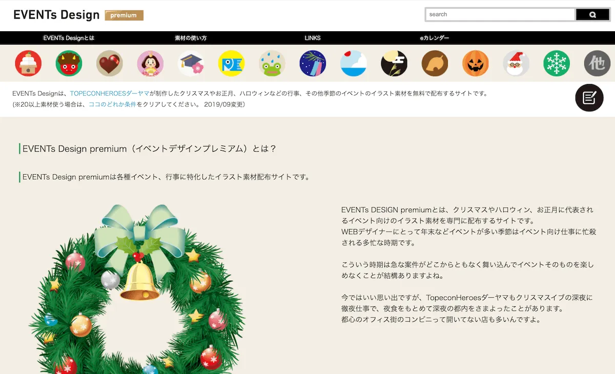 EVENTs Designは、『TOPECONHEROESダーヤマ』さんが制作されたクリスマスやお正月、ハロウィンなどの行事、その他季節のイベントのイラスト素材を無料で配布するサイトです。イベントデザインの素材は累計20個までは無料で使え、20個を超える場合は指定条件のいづれか一つをクリアすると使えるというユニークな使用条件を設けられています。