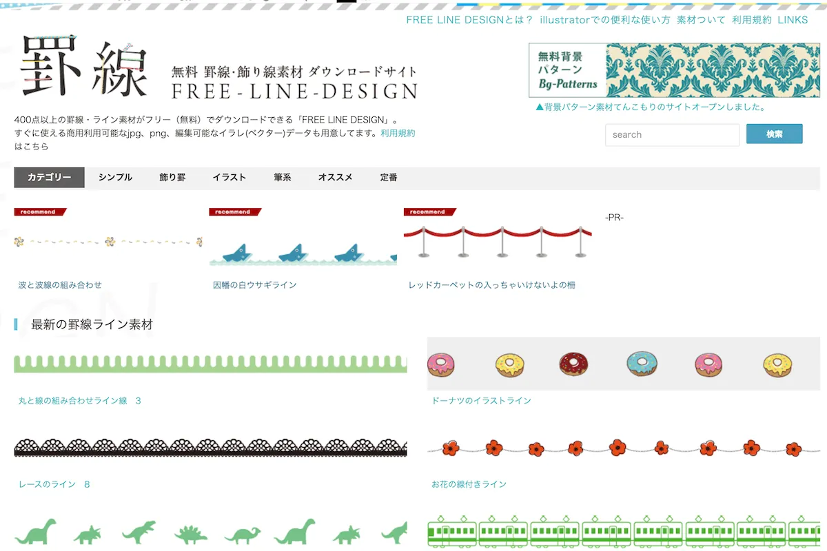 FREE LINE DESIGNは、400点以上の罫線・ライン素材がダウンロードできるサイトです。JPGやPNG、編集可能なillustrator(ベクターデータ)も提供されています。