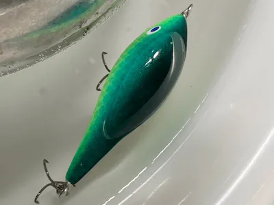 工程で苦労した分、完成した時の達成感は大きかったです。工程中、エアブラシ塗装の感覚がうまく掴めず、ウロコの範囲を広くしてしまったのが非常に心残りなので、いつかリベンジしたいと思っています。その反面、一つ一つの工程が大変なので、心のどこかで「ルアー作りはもうしたくない。」とも思っています。多分、次のリベンジは時間に余裕が出来てからかもしれないなぁ。。。