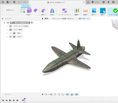【感想】この本のChapter7ではFusion360の特長の1つである「フォームモデリングの基本」を学ぶため、シンプルな飛行機を作ります。フォームモデリングが苦手な私も無事に課題の飛行機の形を作ることが出来ました。(下記写真)