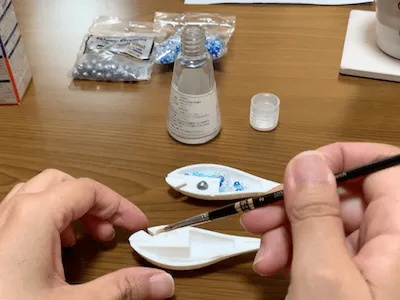 3Dプリンター出力パーツに、重りとビーズを入れ、アクリル樹脂用接着剤で接着。