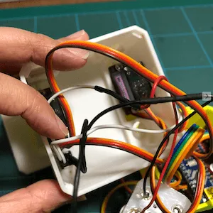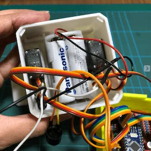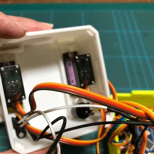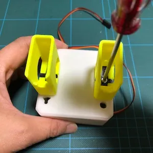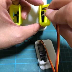 この作業はかなり困難でした。ドライバーが動かしづらい上、サーボの配線を避けつつの作業で、ネジが何度も転がってしまいました。大人でも困難な作業なので、子供は更に苦労しそうです。